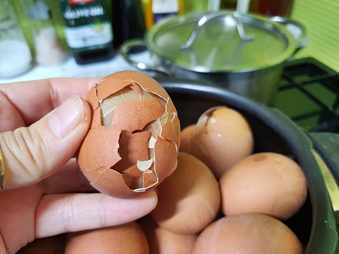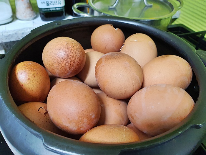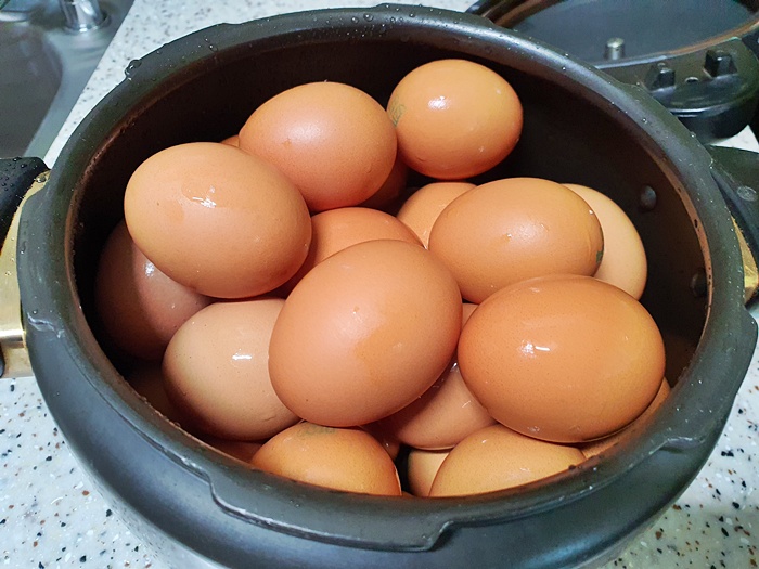 압력밥솥에 1시간 구운 달걀이에요. 압력추에 김이 다 빠지면 뚜껑을 열어 주시는 것도 잊지 마시길..