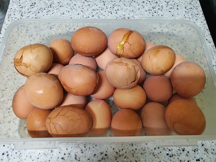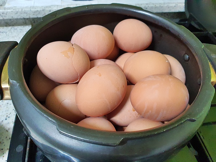 압력밥솥에 1시간 구운 달걀이에요. 압력추에 김이 다 빠지면 뚜껑을 열어 주시는 것도 잊지 마시길..