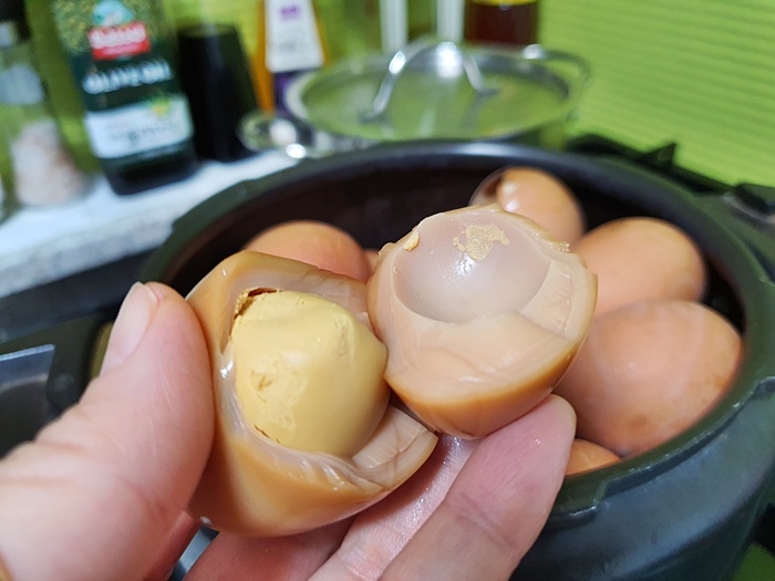 이번엔 1시간 30분 정도 압력밭솥으로 해 봤는데요. 1시간으로 만든 구운달걀 보다 더 쫀득하고 달걀 색도 진했습니다. 이건 완전 목욕탕에서 먹던 그 맥반석 달걀과 흡사했어요.