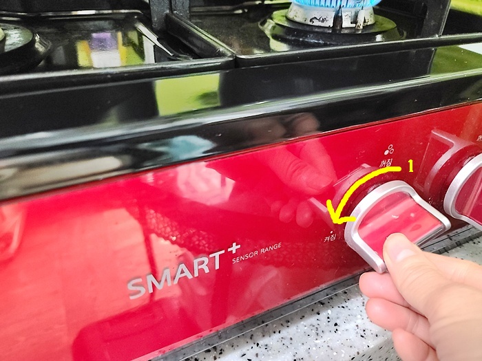 이제는 그 반대로 먼저 손잡이를 돌린 후에 꾹 눌러 주세요. 그럼 한 방에 가스불이 붙어요.