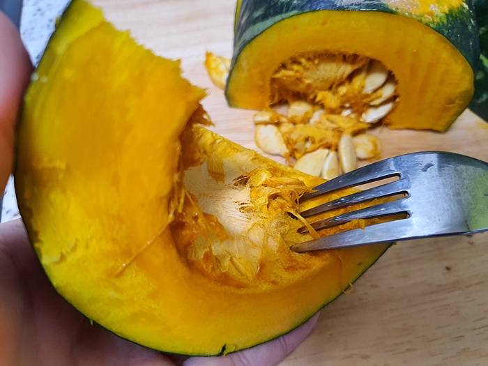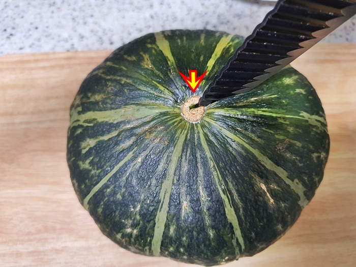 전자렌지에 돌린 단호박을 자를때는 아래쪽으로 칼집을 콕 넣어 자르면 쉽게 잘립니다.