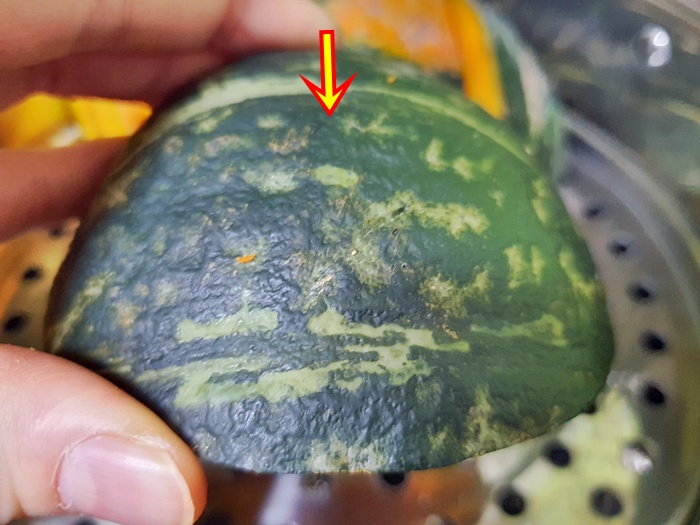 그리고 마지막 팁 하나 더 들어 갑니다. 단호박 찔때는 껍질이 아래로 가면 호박에 물이 고여 당도가 떨어지고 맛이 없어집니다.