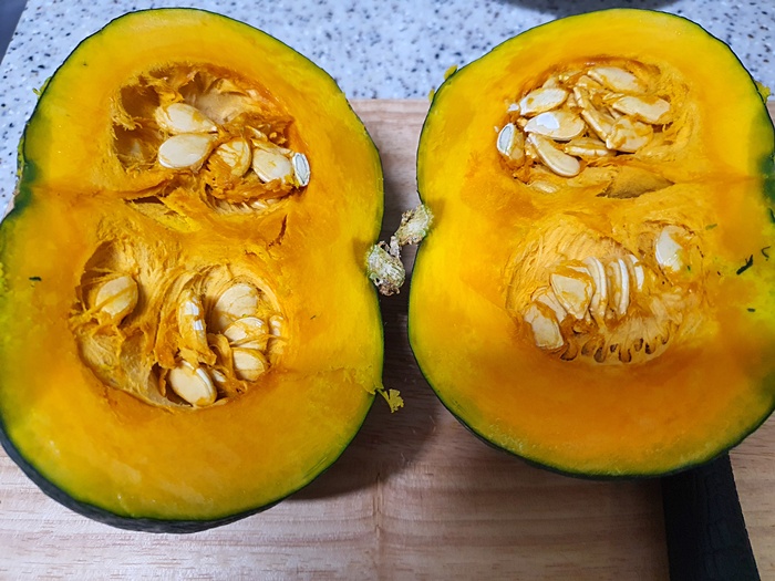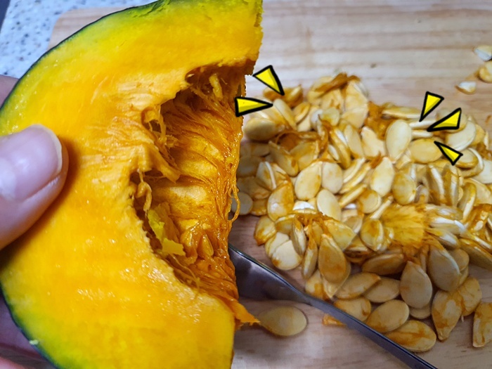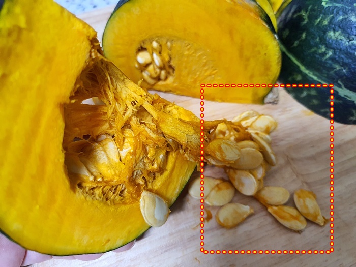 단호박을 잘랐다면 씨를 제거할건데요. 씨는 절대 전체적으로 박박 긁지 마세요. 실처럼 생긴 것이 제일 영양가가 높은 비타민이랍니다. 사실 씨만 제거하기 쉽지 않겠다라는 분들 위해 노하우 하나 더 들어 갑니다.