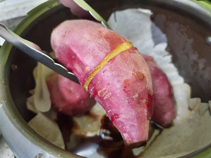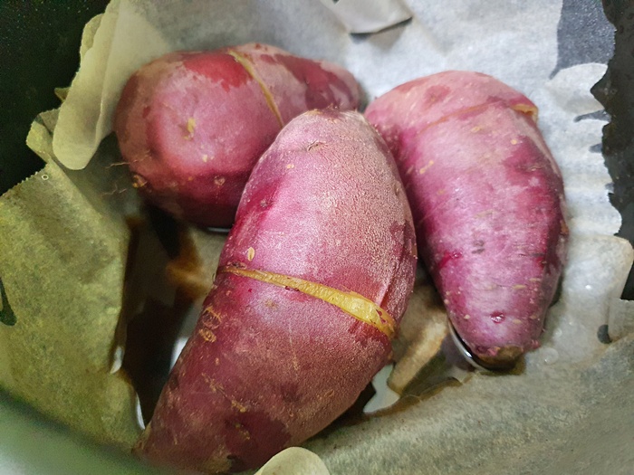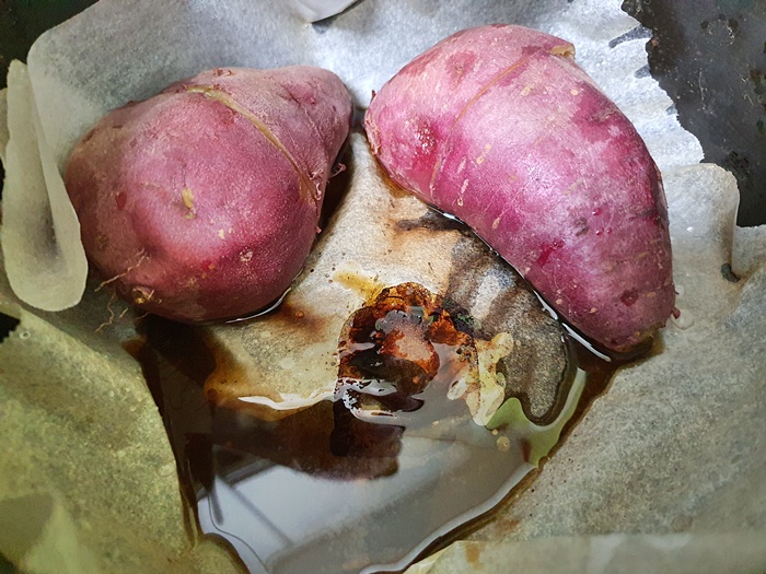이렇게 종이호일을 깔고 고구마를 올린 후 약불에서 약 15분 정도 두면 맛있게 잘 익어요.