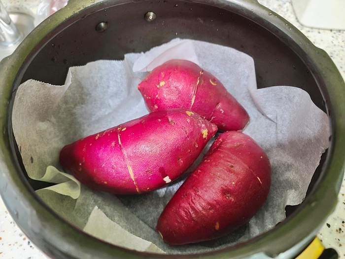 그리고 오늘의 꿀팁 들어 갑니다. 고구마를 밥솥에 삶을때는 종이호일을 깔아 주면 고구마가 타서 밥솥을 씻을때 절대 힘들지 않고 간단히 해결된답니다.