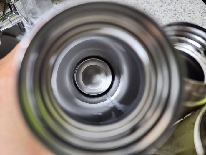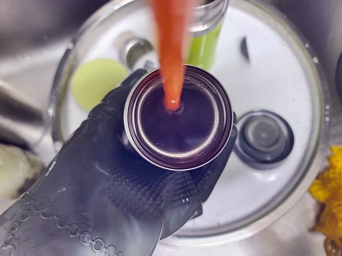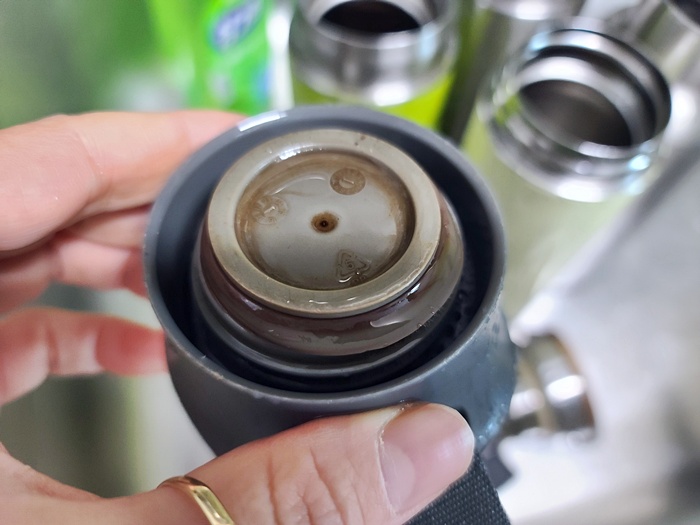 바로 꺼내서 보니 많이 착색된 텀블러 뚜껑이 깨끗해진 모습이예요. 이제 솔과 수세미로 닦기만 하면 됩니다. 꼬질꼬질한 때가 뜨거운 물로 인해 정말 잘 지워집니다.