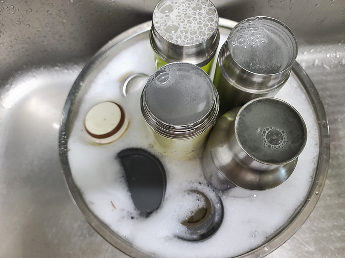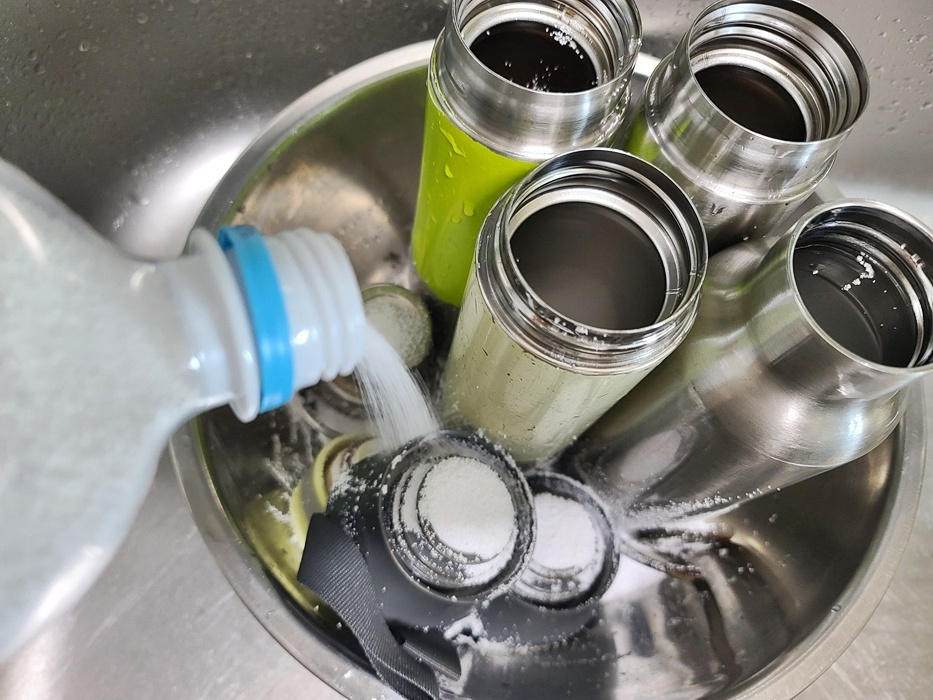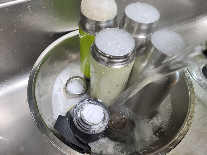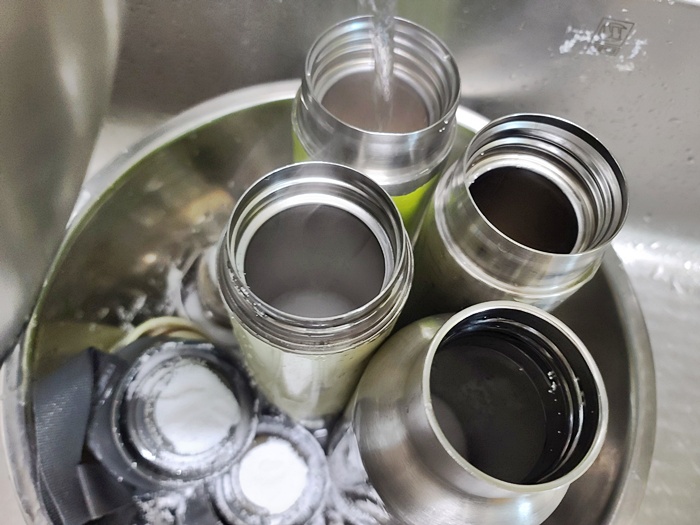 텀블러 뚜껑도 마찬가지로 넉넉하게 과탄산소다를 뿌렸어요. 고무패킹은 분리해서 담궜고요.