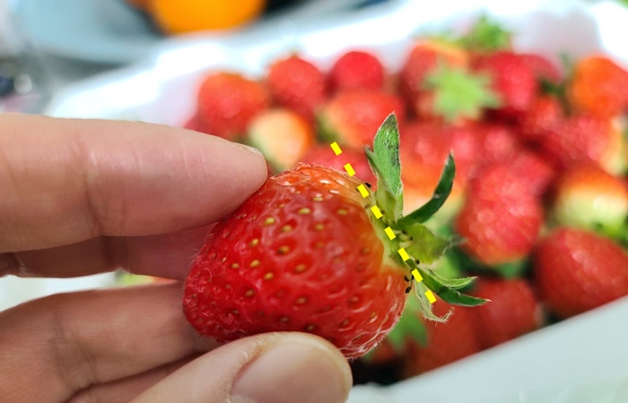 딸기 씻는 법은 먼저꼭지를 제거해 둡니다. 칼로 자르지 말고 손으로 꼭지만 손으로 '똑' 뜯으세요. 그 다음은 물에 담궈서 1분 정도 둔 뒤 흐르는 물에 재빨리 씻어주면 됩니다. 너무 많이 물에 담궈두면 물러지기 쉬워요.