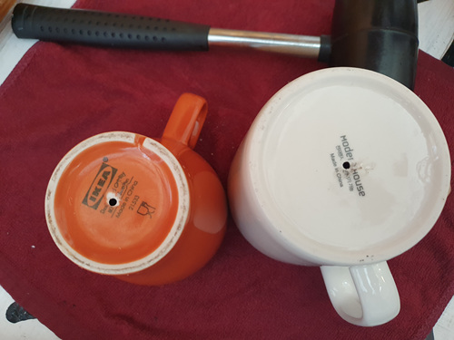 머그컵에 구멍 뚫기 솔직히 완벽하게 잘 되지 않을 때가 많았어요. 하지만 지금은 마치 원래 구멍 난 컵처럼 완벽하게 구멍을 뚫는답니다. 구멍을 낼 곳에 스카치테이프를 붙여 준 뒤 송곳을 꽂아 고무망치로 몇 번만 두드려 주세요. 너무 세게 말고 부드럽게 해 주면 쉽게 구멍이 뚫립니다. 구멍이 정말 깔끔하게 잘 뚫렸죠. 다른 컵도 같은 방법으로 구멍을 뚫었습니다.
