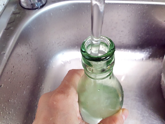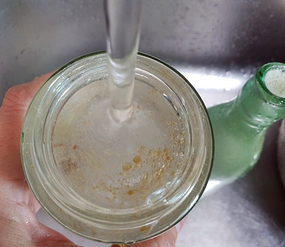 이제 본격적으로 기름병을 세척할건데요. 먼저 온수를 이용해 기름을 한 번 헹궈 냅니다.