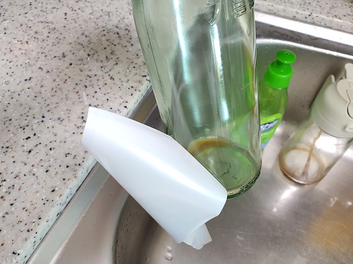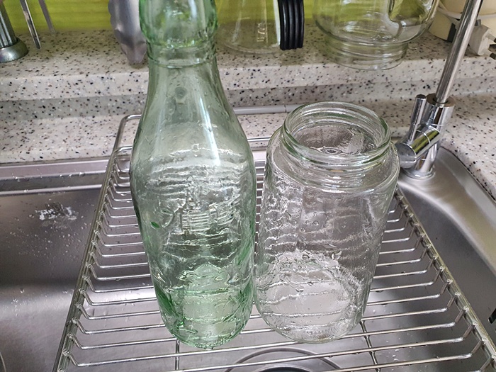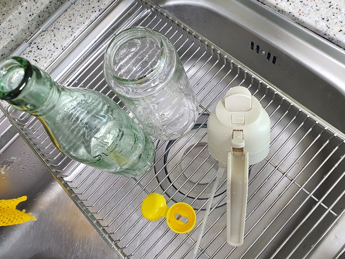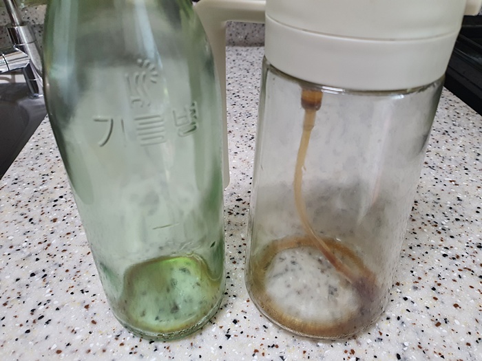 깔끔해진 기름병을 보니 기분이 산뜻해졌죠. 이제 잘 말려서 재활용 하면 됩니다. 같은 기름병이 여러 개라면 이것 또한 주방에서 인테리어 효과도 은근히 하게 되더라고요.