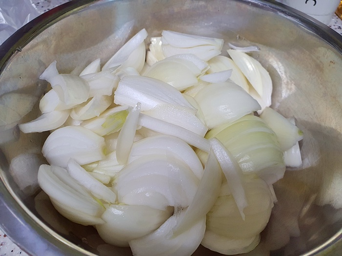 양파는 베란다에 보관하고 하나씩 꺼내 요리해요. 구멍 송송 뚫린 바구니에 넣어 두면 다 먹을때까지 상하지 않더라고요.