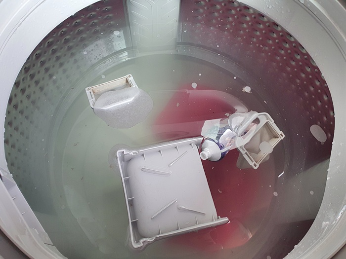 세탁기 표준코스로 5분 돌렸을때 모습입니다. 물도 뿌옇고 어디서 나왔는지 이물질이 둥둥 떠 있어요. 이런 것들은 잘 제거하지 않으면 빨래를 했을때 옷에 묻어 나오기도 하지요.