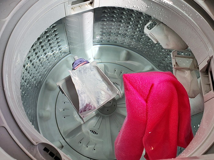마지막으로 걸레와 자투리 치약 남은 것을 같이 넣어 줍니다. 자투리 치약을 넣는 이유는 세탁조 내부 청소하는데 한 몫 차지 하더라고요. 그냥 버리면 아까우니 이것도 계면활성제이니 세탁조 청소 할때 유용합니다.