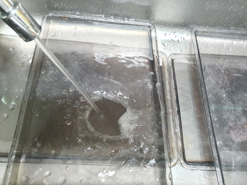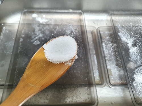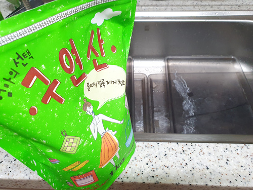 씻어야 할 물받이에 구연산을 넉넉히 뿌려 주세요. 그 다음 온수를 받아 주세요. 그래야 구연산이 잘 녹아요.