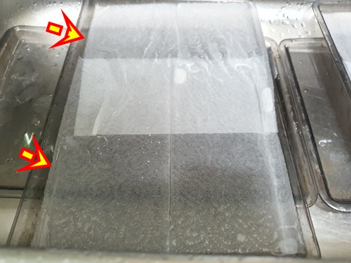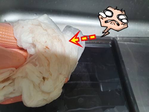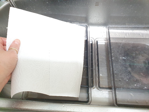 온수를 부었다면 그 위에 키친타월을 올려 주세요. 이 상태에서 그냥 30분 정도 방치해 줍니다. 30분 후 키친타월을 걷어 보면 놀라실 거예요.