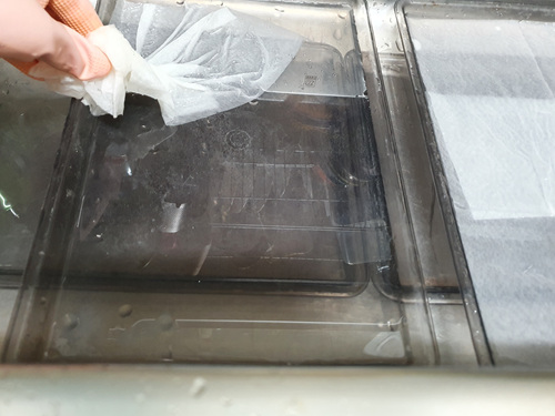 얕게 낀 물때는 자연스럽게 녹아 없어졌고요. 많이 낀 물때는 키친타월로 쓰~윽 닦으면 순식간에 안 지워질 것 같은 물때가 지워집니다.