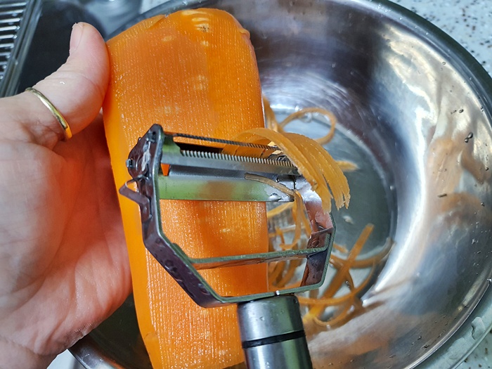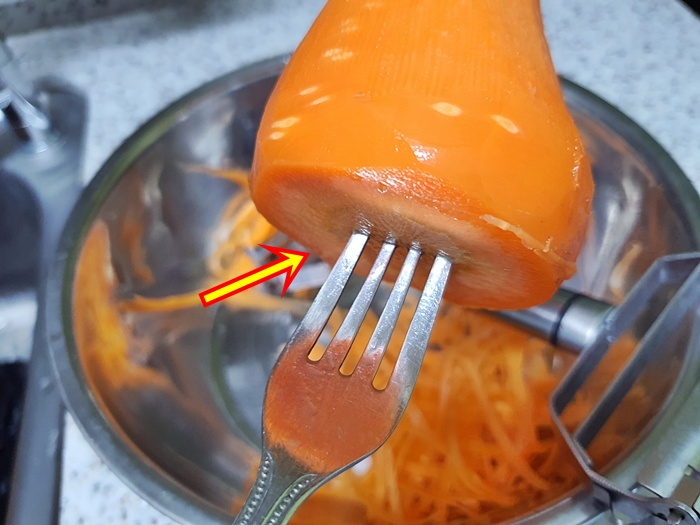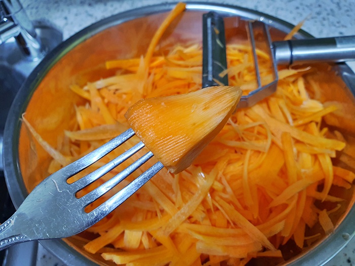 당근이 커서 채 썰기 정말 좋아요. 그런데 채 썰기를 하다 자칫 손을 다칠 위험이 있잖아요. 그럴때는 포크를 사용해서 채를 썰어 보세요. 정말 신박하답니다.