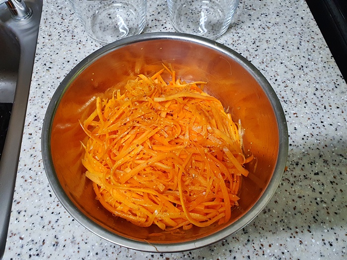 당근 뿐만 아니라 무를 채 썰때도 같은 방법으로 하면 손 다칠 위험이 없답니다. 초보 요리자 분들은 따라하시면 좋을 듯 해요. 나름대로 꿀팁이거든요.