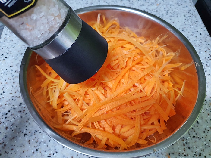 그 다음은 준비한 재료를 넣고 같이 버무려 주면 됩니다. 보통 당근을 10분 정도 소금에 절여 두고 사용하는데 전 몇 분만 두고 바로 했어요. 오히려 아삭아삭 하니 더 맛있는 것 같더라고요.