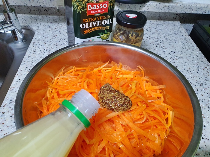 채 썰고 남은 자투리 당근은 바로 먹으면 되고요. 완전 달달해요. 역시 제주도 당근이쥬~ 당근라페 만들때 들어가는 재료는 소금, 홀그레인머스타드, 올리브오일, 스테비아, 레몬즙 약간, 후추 조금 들어가요.