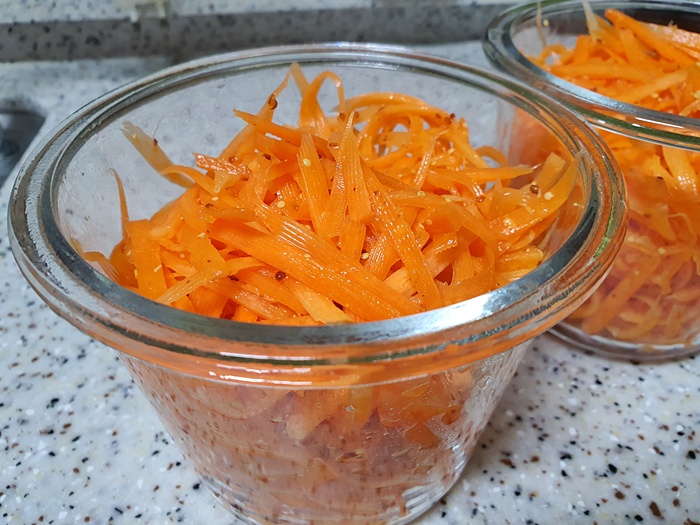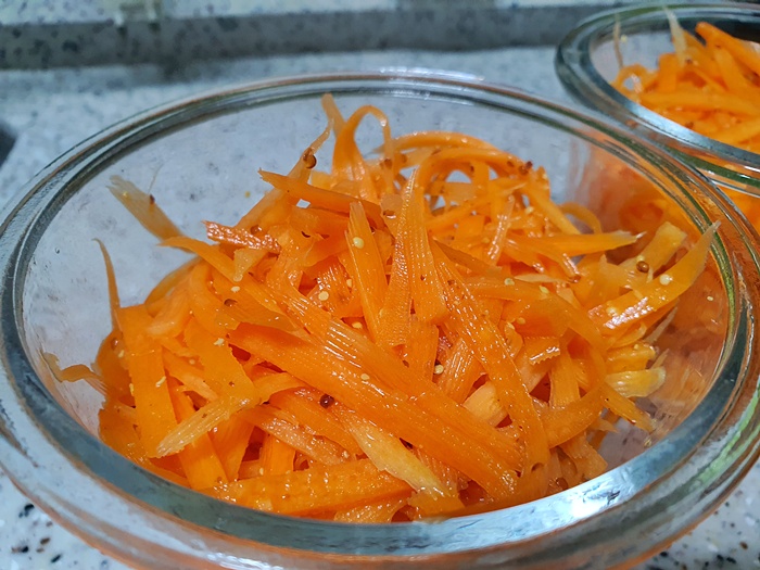 완전히 절여진 상태가 아니어서 더 아삭함이 있어 맛있습니다. 이렇게 만든 당근라페는 1시간 정도 숙성 후 드시면 됩니다. 물론 바로 먹어도 정말 맛있어요.