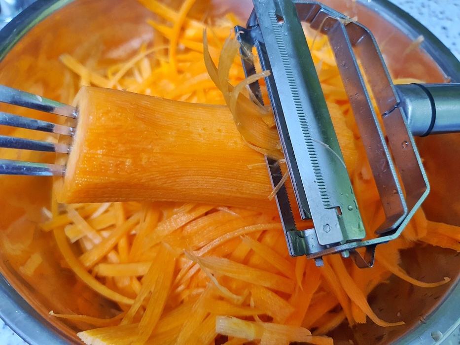 당근 뿐만 아니라 무를 채 썰때도 같은 방법으로 하면 손 다칠 위험이 없답니다. 초보 요리자 분들은 따라하시면 좋을 듯 해요. 나름대로 꿀팁이거든요.