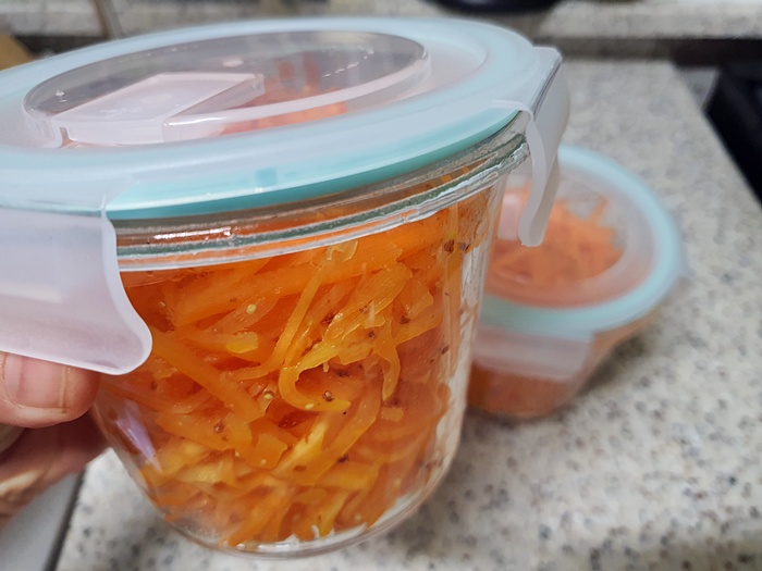 대부분 사람들은 며칠 숙성 후 먹는게 더 맛있다고들 하던데 전 아삭할때 먹으니 더 맛있었어요. 물론 며칠 두고 먹을 만한 양이 아니었지만요. 남편도 맛있다며 잘 먹어서 하루 걸러 당근라페를 만들 정도랍니다. 당근이 냉장고에 넘쳐나니 없어질때까지 열심히 먹으려고 합니다. 입맛 없을때 당근라페 만한게 없다는 사실~
