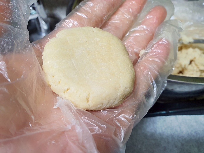 반죽을 할때는 1회용 비닐장갑을 착용하고 해야 손에 들러붙지 않습니다.