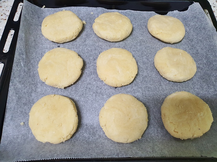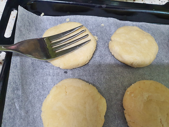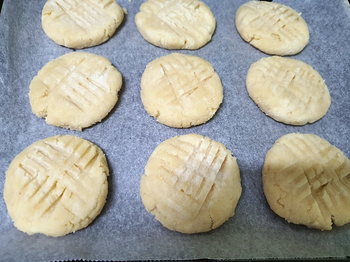 모양은 원하는대로 해 주시면 되세요. 전 납작하고 동그랗게 했어요. 거기에 포크를 이용해 모양도 조금 내줬답니다. 버터쿠키처럼 말이죠.