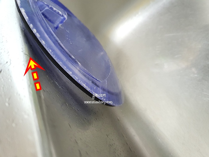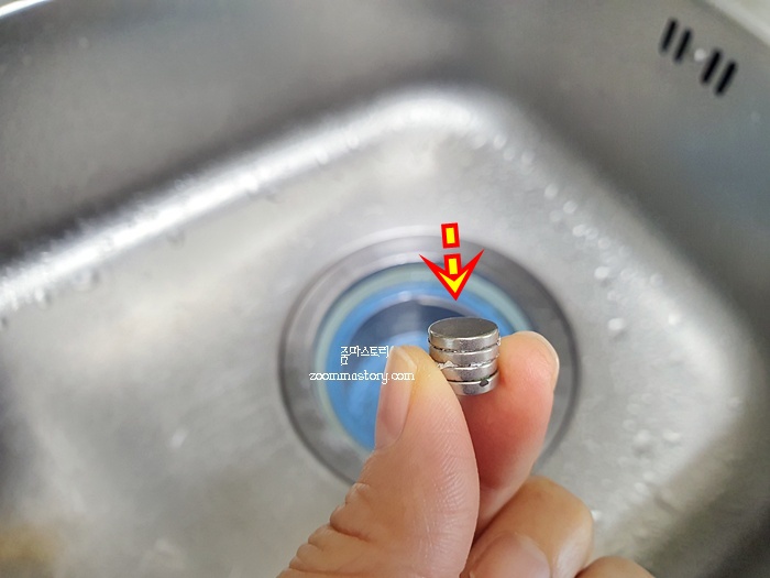 이렇게 원하는 곳에 붙여 두는 이유은 안쪽 싱크대에 자석끼리 서로 꽉 붙게 하기 위함입니다. 배수구 뚜껑 안쪽에 자석을 붙여 두었잖아요. 그거랑 서로 맞붙게 하면 된답니다.