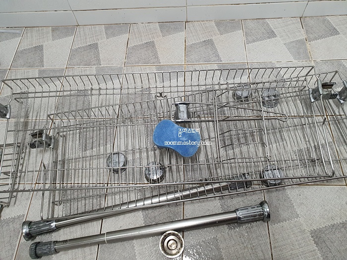 스텐 선반은 미온수를 먼저 뿌린 후에 수세미에 주방세제를 묻혀 닦으면 쉽게 녹이 제거됩니다. 분리해도 부피가 커서 욕실에 가져와서 닦기로 했답니다. 주방에선 엄두도 못낼 일이라....