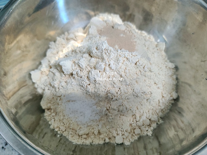 ( 이스트와 소금이 서로 섞이지 않게 통밀가루에 섞은 뒤 덮어 주어야 해요. 그렇게 하는 이유는 소금과 이스트가 만나면 발효가 안되기 때문입니다. )