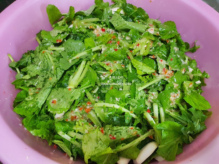 보통 열무를 깨끗이 헹군 뒤 물기를 제거하면 한 두시간은 기다려야 하잖아요. 그런 시간을 전 완전히 단축한 셈입니다.