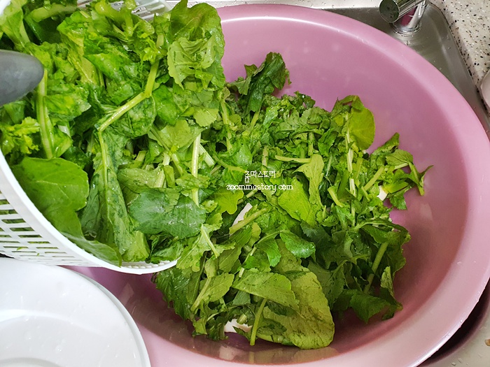 다듬을 것 없는 열무라 소금 약간 절여 깨끗이 씻어 먹기 좋게 썰어서 물기를 제거하기로 했는데요. 양이 많다보니 받쳐 놓을 채망이 부족할 정도이기도 하고 바로 열무 물김치를 담을거라 물기를 빨리 제거하기로 했지요.