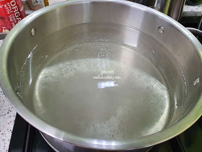 피클 시럽은 물 2컵, 식초 1컵, 설탕 1컵, 소금 약간 필요해요. 냄비에 분량의 양념을 넣은 뒤 팔팔 끓여 주시면 되세요.