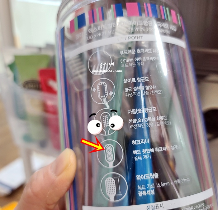 새 칫솔이 담긴 통 뒷면에 자세히 적혀진 사용법.. 혀크리너 사용법이었죠... 칫솔 헤드 뒷면에 혀크리너 설계로 설태 제거 가능하다는 내용이었는데 지금껏 칫솔이나 다른 전용 혀크리너를 구입해 사용 했으니 말입니다.