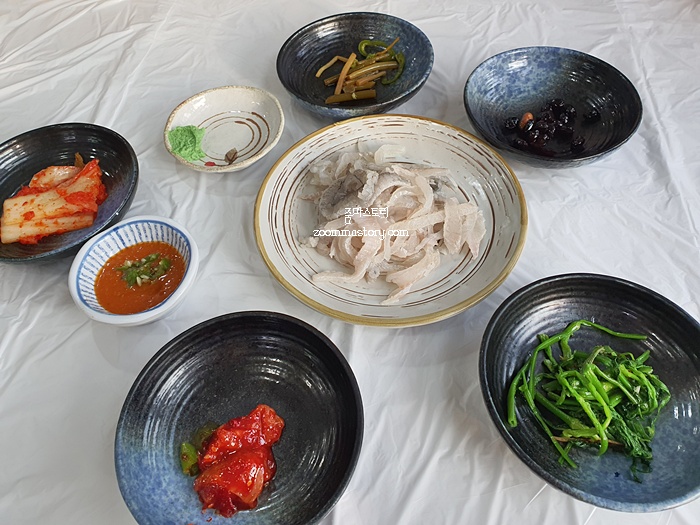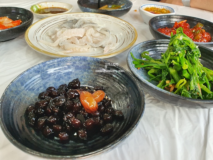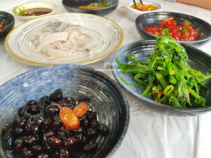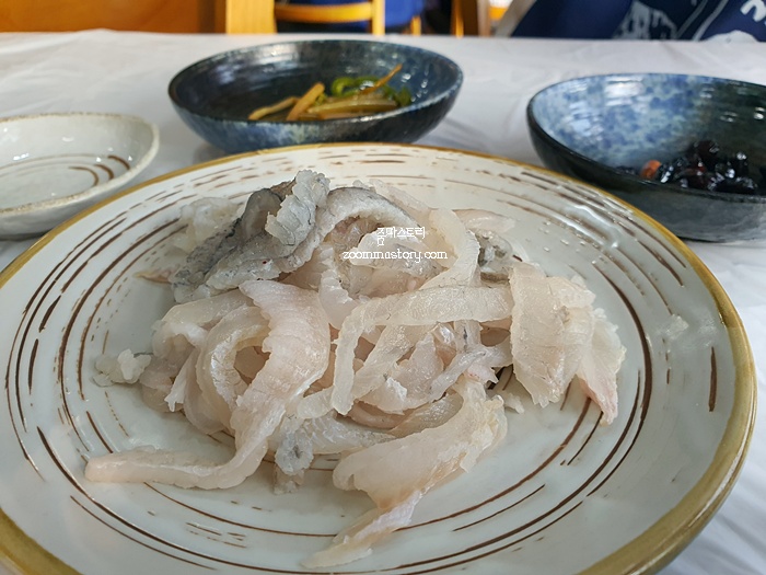 도다리 물회와 매운탕을 주문하면 도다리 회가 나온다. 양은 그렇게 많지는 않지만 맛을 보라는 의미라기엔 부족함이 없다. 반찬은 4가지 정도 나오는데 직접 만든 반찬이 은근히 맛있다. 물론 한 두 가지이지만...