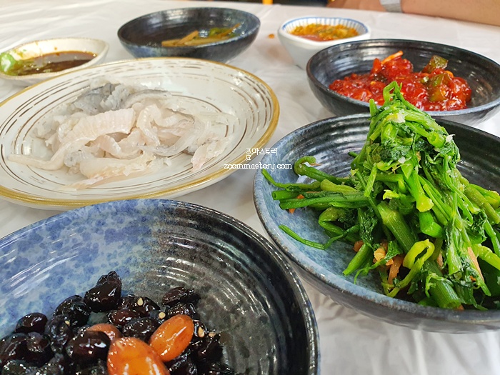 도다리 물회와 매운탕을 주문하면 도다리 회가 나온다. 양은 그렇게 많지는 않지만 맛을 보라는 의미라기엔 부족함이 없다. 반찬은 4가지 정도 나오는데 직접 만든 반찬이 은근히 맛있다. 물론 한 두 가지이지만...