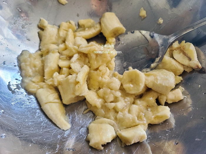 바나나가 많이 남아서 전 이것도 다 사용하기로 했답니다. 여름철엔 바나나 빨리 안 먹으면 초파리가 날라 다니기 때문에 그전에 먹는데 제일 좋더라고요. 그래서 전 빵 자주 만들어 먹어요. 오늘처럼 너무 많다 싶으면 소분으로 포장해서 냉동실에 넣어 두었다가 먹고 싶을때 하나씩 꺼내 먹으면 이만한 간식이 없답니다.