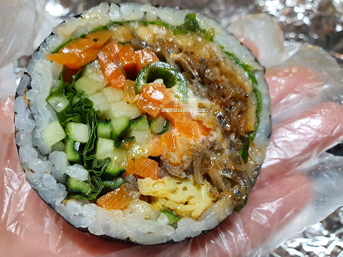 손바닥이 가려질 정도로 제법 큰 김밥이다. 젓가락으로 먹기는 불편하니 1회용 비닐장갑을 착용하고 먹는게 제일 편하다. 김밥 1줄만 먹어도 배가 든든할 정도로 양이 상당하다.