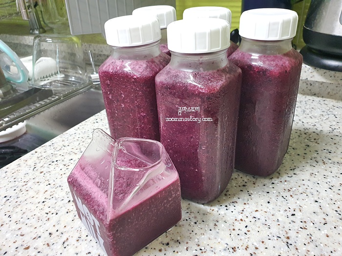 전 냉동 되어 있던 과일이 많아서 넉넉히 만들기로 했답니다. 만들어 두면 쥬스가 생각날때 조금씩 마시면 시중에 파는 쥬스가 생각이 안 날 정도랍니다.