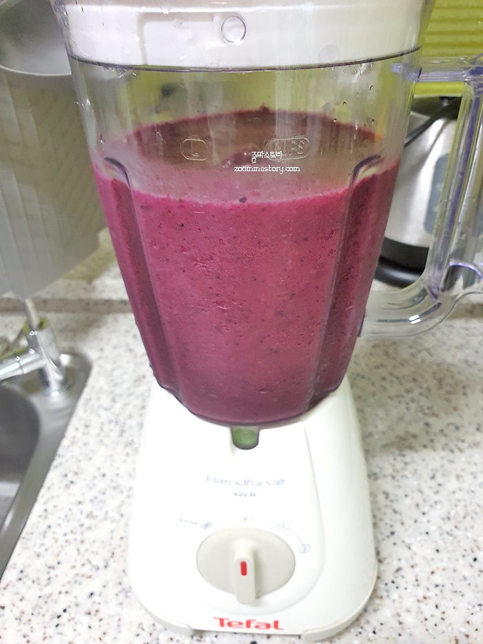 과일 쥬스도 다 먹어가고 냉동실 정리도 할겸 냉동 과일로 쥬스를 만들어 봤어요. 일명, 바나나 블루베리 쥬스라고 할까요. 두 과일의 공통점은 변비에 좋고 건강에도 좋으니 만들어 드시는데 호불호가 따로 없을 듯 해요. 블루베리는 세계 10대 슈퍼 푸드로 유명한 과일인거 다 아시죠. 안토시아닌이 풍부해 눈의 피로 예방은 물론 시력보호는 기본이고 강력한 황산화 물질로 노화 방지에 면역력 강화에도 탁월하니 집에 쟁여 놓고 먹는 편입니다. 나만 그런거 아니죠~