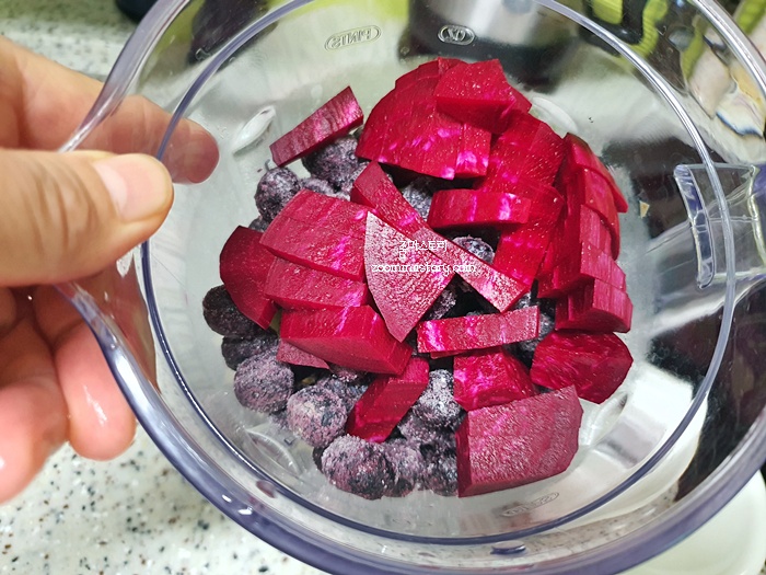 바나나 1개, 블루베리 30알, 물 200ml, 비트 8조각 (생략가능)