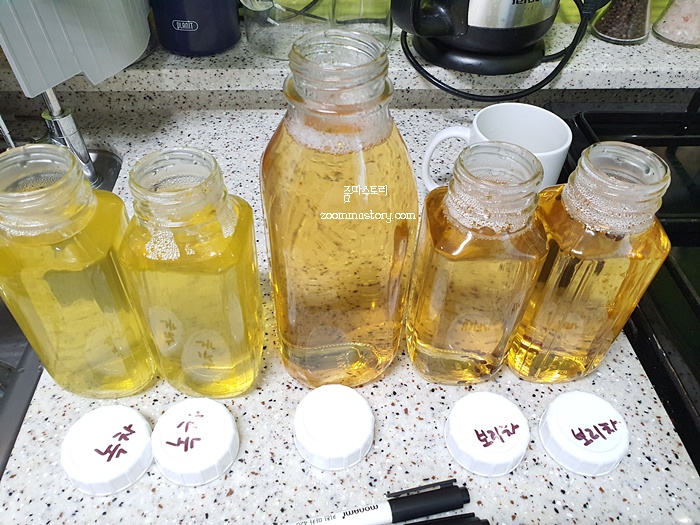 전 물을 끓인 후에 이렇게 뚜껑에 글을 적어 놓습니다. 남편도 냉장고에 물을 꺼낼때 헷갈리지 않고 좋아 하더라고요.