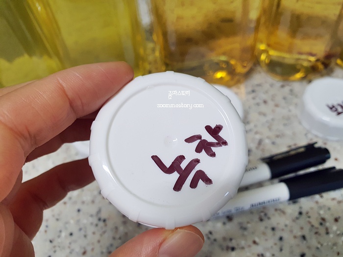 전 물을 끓인 후에 이렇게 뚜껑에 글을 적어 놓습니다. 남편도 냉장고에 물을 꺼낼때 헷갈리지 않고 좋아 하더라고요.