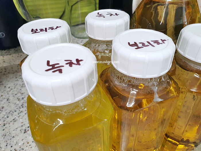 오늘도 보리차 한 주전자를 끓이면 녹차도 뜨거운 물에 내렸어요. 이렇게 끓인 음료는 식혀서 냉장고에 넣어 두고 시원한 물이 마시고 싶을때 꺼내 먹으면 정말 좋더라고요. 생수를 예전에는 여름 내내 사 먹었는데 방송에서 미세프라스틱이 많다고 해 왠만하면 끓여서 물을 먹어요.