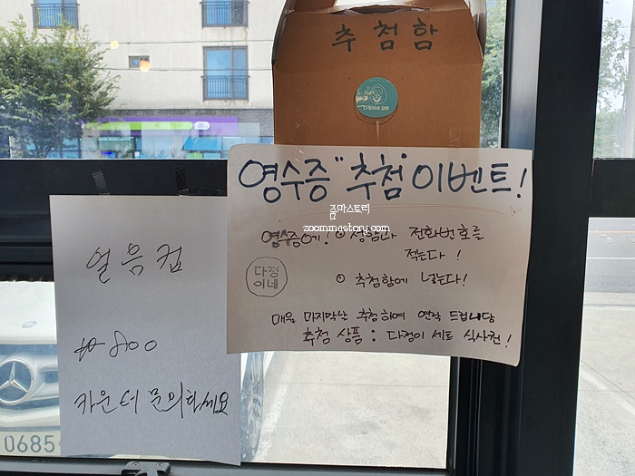 어딜가나 요즘엔 이벤트 하는 음식점들이 많다. 이곳도 그랬다. 혹시나 모르니 나도 영수증 추첨에 도전해 보기로 하고 넣었다. 매월 마지막 날이 추첨일인데 ....음.... 떨어졌나 보다.