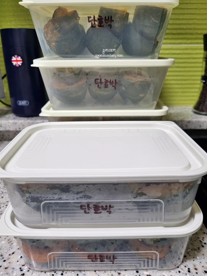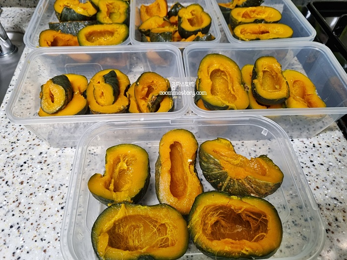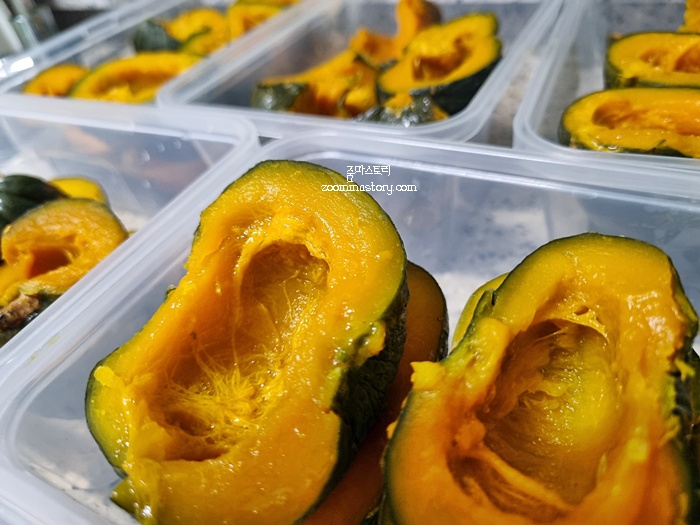 한 솥 쪄내고 또 한 솥 쪄냈어요. 단호박은 이렇게 쪄 낸 뒤 식혀서 냉동보관하면 오래도록 두고 먹을 수 있답니다. 만약 단호박을 자른 뒤엔 3~ 5일 이내로 드시는거 추천해요. 공기 중에 세균에 노출되기 때문에 신선도 뿐만 아니라 곰팡이등이 생길 수 있기 때문입니다. 되도록이면 익힌 뒤 냉동보관 권장합니다.