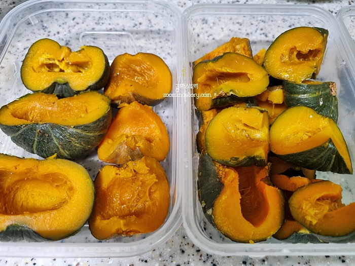 한 솥 쪄내고 또 한 솥 쪄냈어요. 단호박은 이렇게 쪄 낸 뒤 식혀서 냉동보관하면 오래도록 두고 먹을 수 있답니다. 만약 단호박을 자른 뒤엔 3~ 5일 이내로 드시는거 추천해요. 공기 중에 세균에 노출되기 때문에 신선도 뿐만 아니라 곰팡이등이 생길 수 있기 때문입니다. 되도록이면 익힌 뒤 냉동보관 권장합니다.